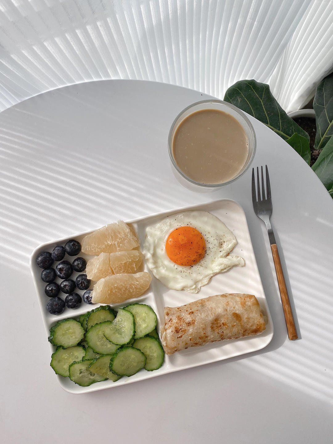 阿白酱白酱 做过 吃个快手早餐再上班吧 No.92 | 有光影的早餐真美好/煎蛋/手抓饼夹香蕉奶酪/清炒黄瓜/蓝莓/拿铁 阳光透过窗帘洒在餐桌上秋风随意地吹着窗帘舞动耳边响着沙沙的树叶声吃着早餐真美好#早餐•2022年10月15日# 2022-10-15