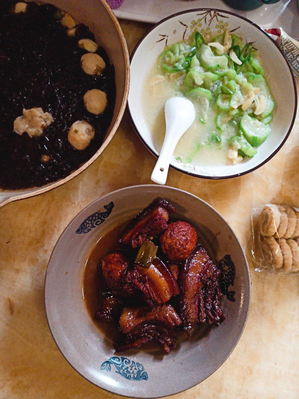 把子肉,小炒丝瓜,丸子紫菜汤