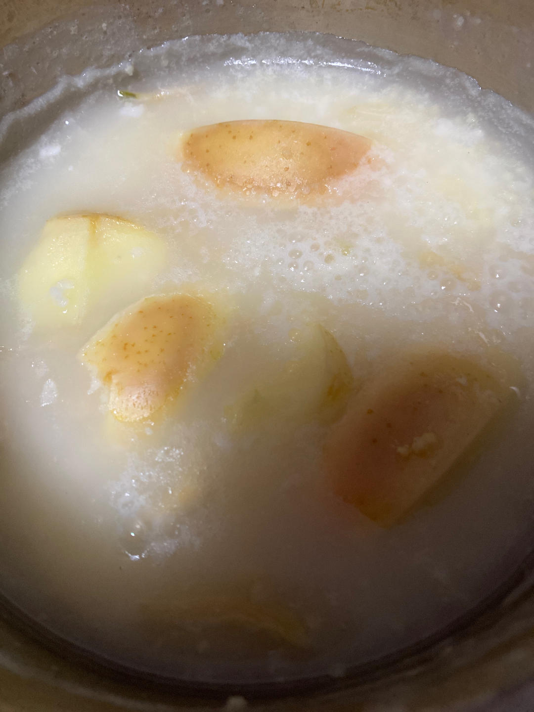 小产了,我要开始食疗了。黄小米薏仁粥自己放了苹果块在里面。