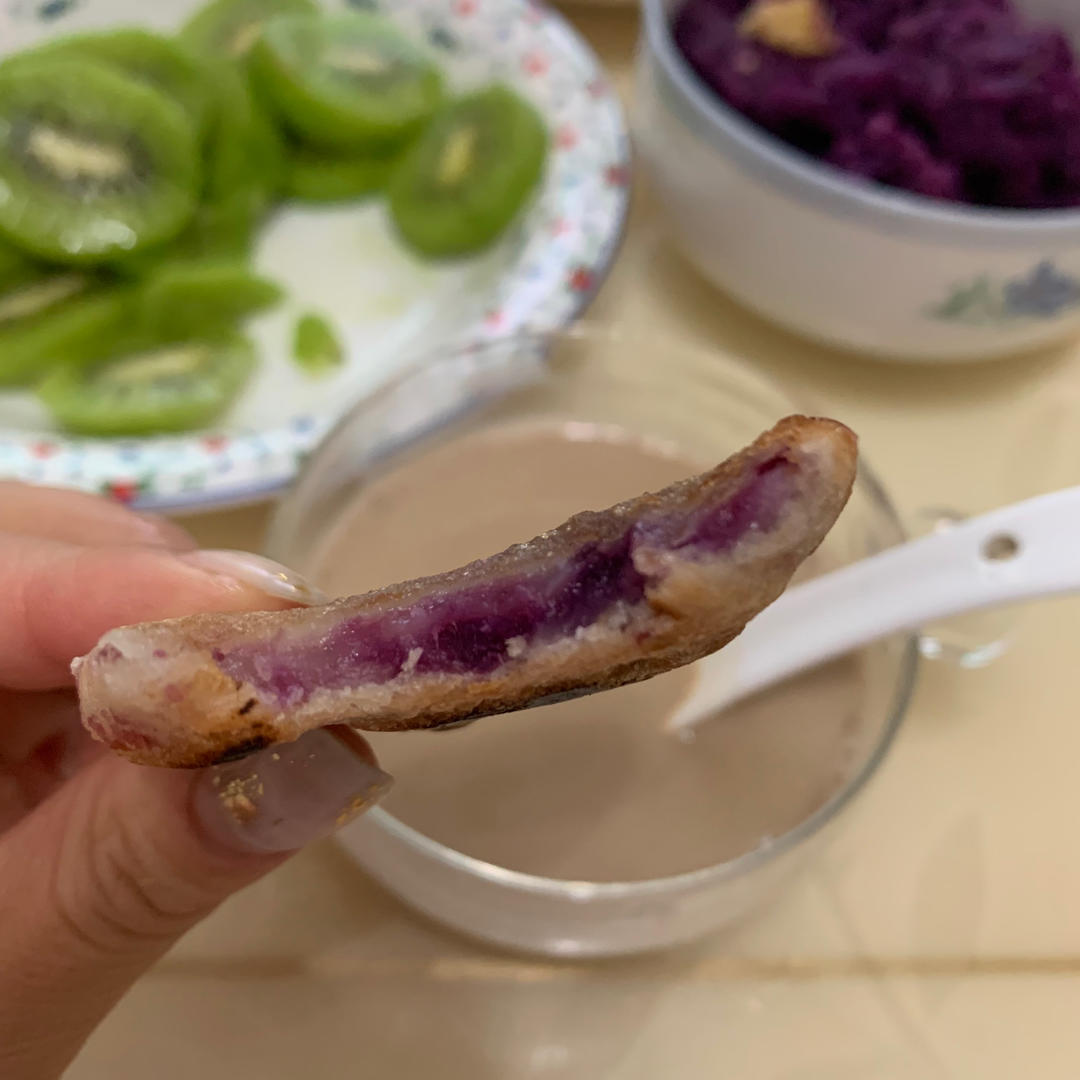 糯米粉包紫薯的时候,粘得我怀疑人生。几个饼包了一个多小时,太麻烦了。