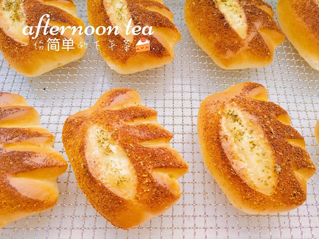 表面装饰用的芝士粉混合了甜椒粉,颜色也超级棒哦~方子*0.6做了300克面粉的,一共8个