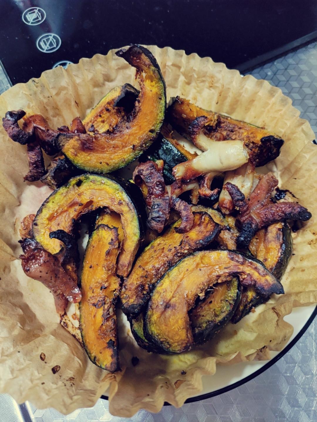 加了点油黑胡椒海盐跟孜然,180度22分钟,有点烤过火,但是真好吃😋