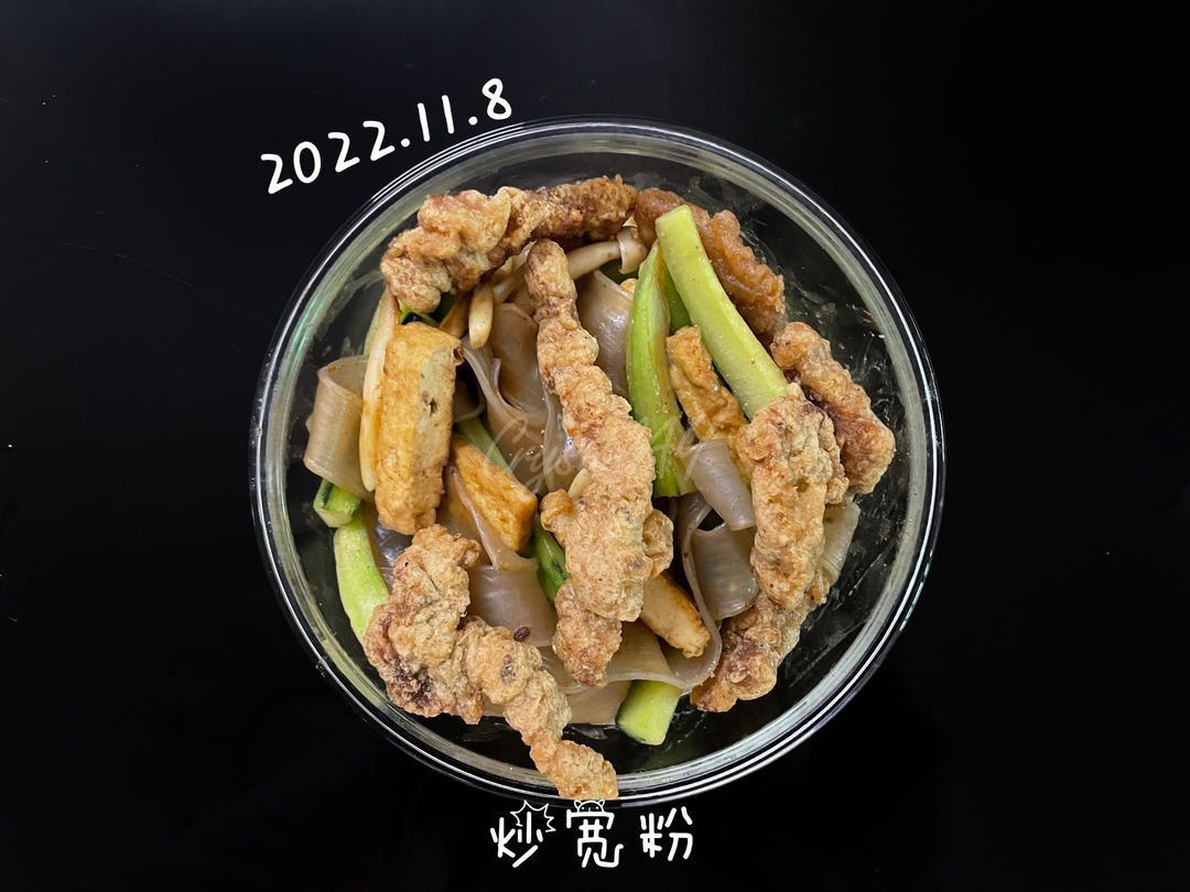 CrystalAY 做过 🍱便当日记 工作日午餐「佛系减脂」 #午餐•2022年11月8日# 炒宽粉一人份材料:小酥肉一份,宽粉九根,青瓜一根,海鲜菇60g,豆干两片,沙茶酱一勺,蚝油一勺,酱油一勺 2022-11-08