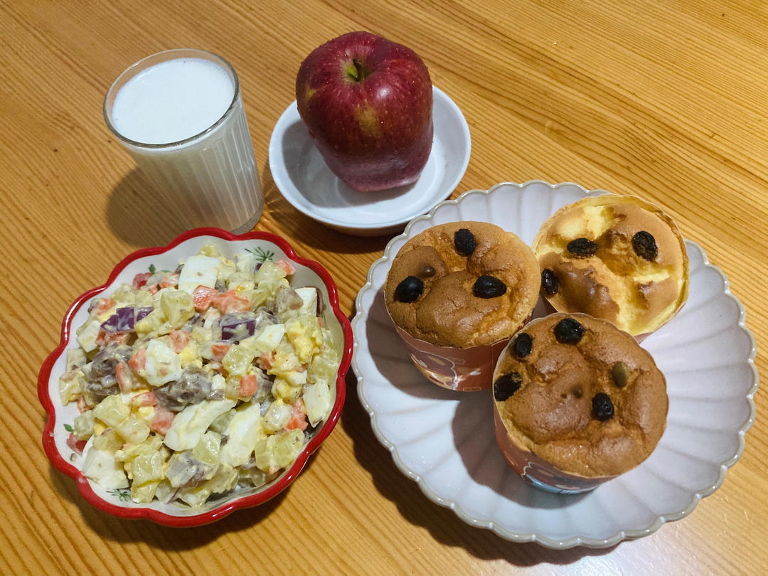 土豆鸡蛋沙拉+杯子蛋糕+牛奶+苹果