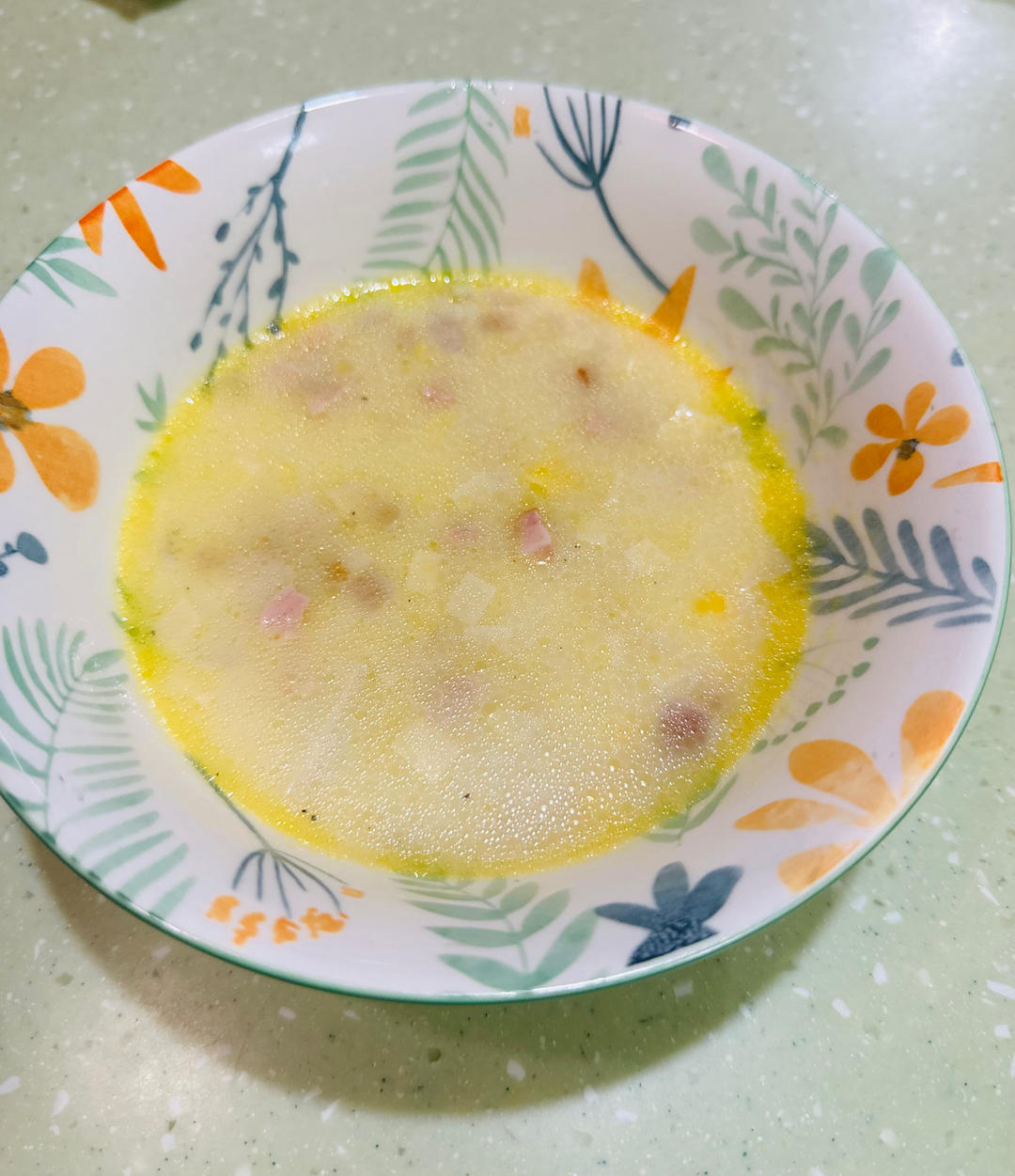 火煺玉米浓汤。这次水加多了不够浓。
