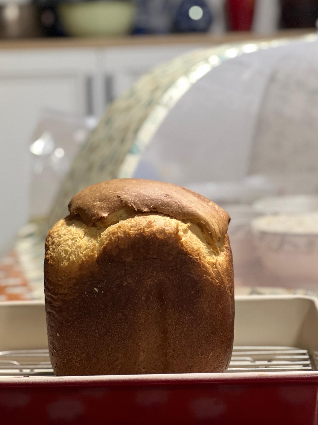 食后感:略油腻,口感不轻盈,砂糖可增加5-10g,冰牛奶+全蛋共140g(加减10g)或者不加鸡蛋,黄油可减至10g或者不加。烤色选“淡”,每次都要忘记。