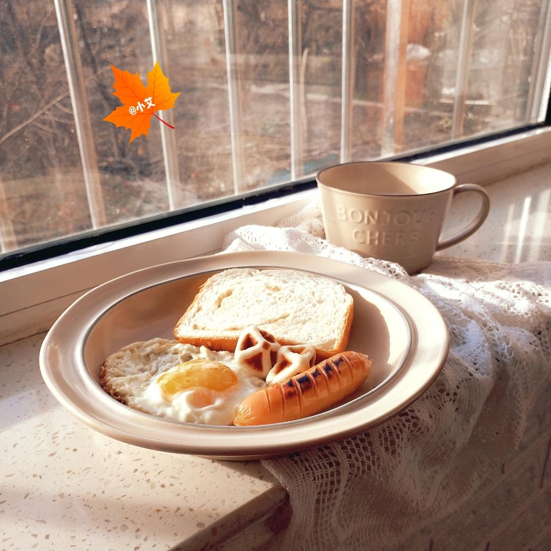 小艾的早餐之橙皮吐司片,煎蛋,玉米肠,华夫饼,牛奶
