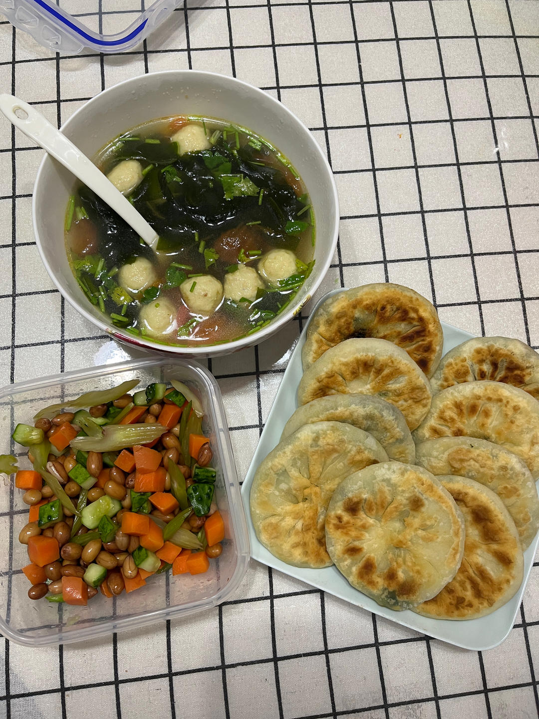 韭菜馅饼,裙带菜汤,拌的小凉菜