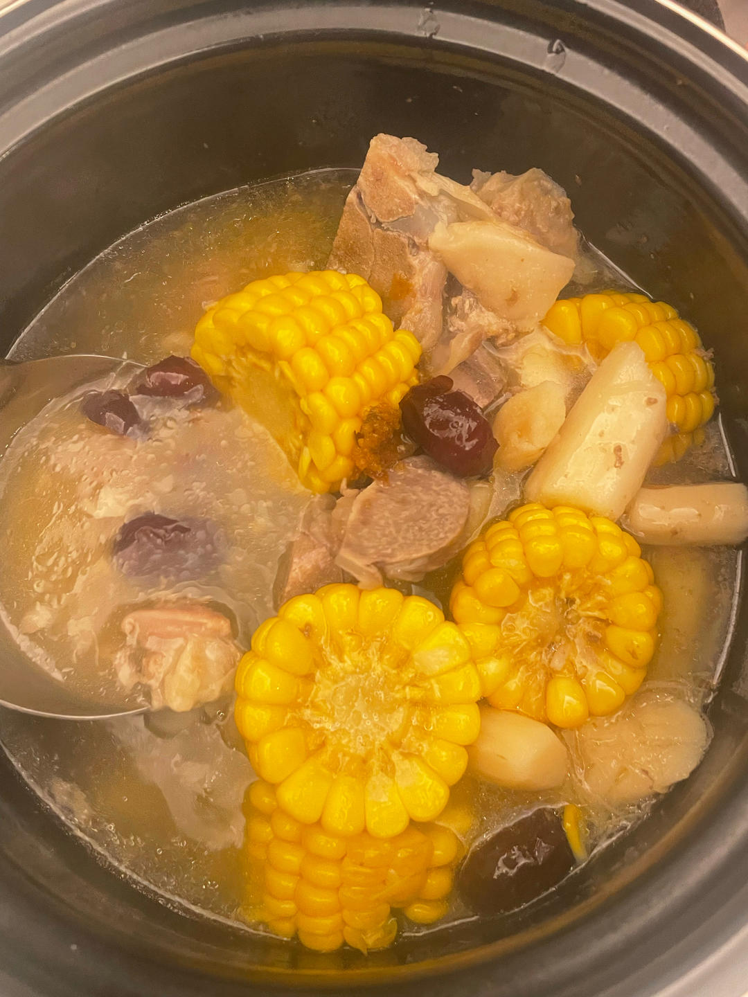 山药玉米筒子骨汤,2勺盐,1勺鸡精,一点白胡椒粉,完美
