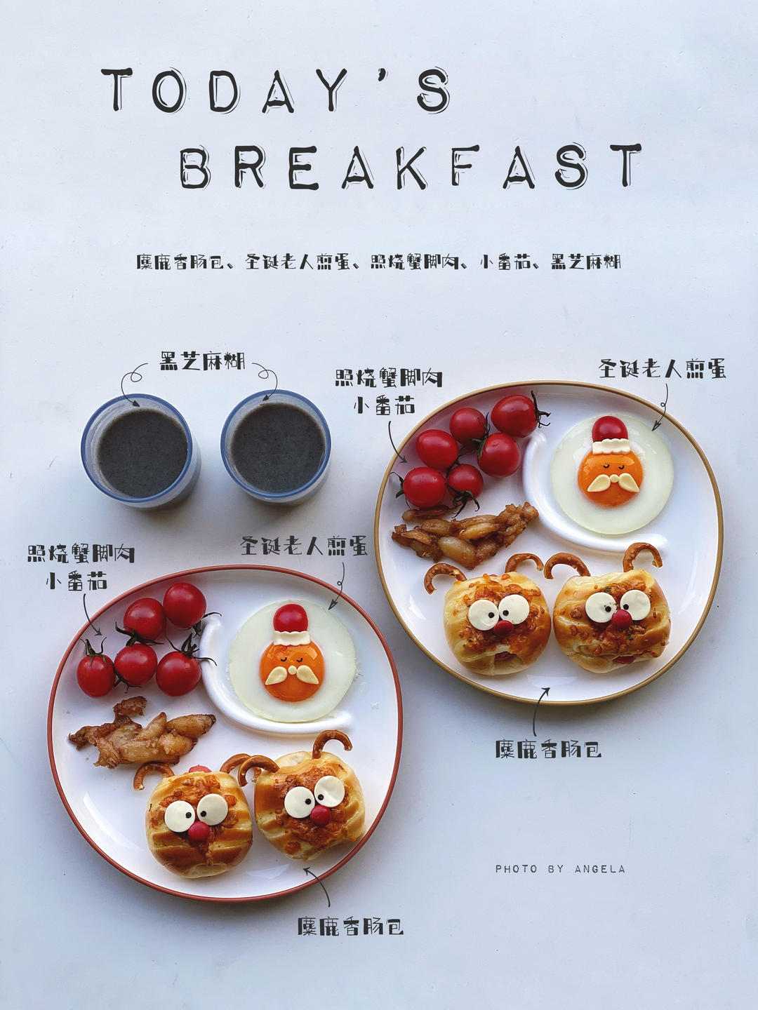 貓曉喵Angela 做过 貓媽私廚 #貓媽私廚##早餐•2022年12月13日# #Hueyの小餐桌# #Yanasの食趣儿##小学生早餐# #幼儿园早餐#兄妹早餐【麋鹿香肠包➕圣诞老人煎蛋🍳➕照烧蟹脚肉➕小番茄🍅➕黑芝麻糊】 2022-12-13