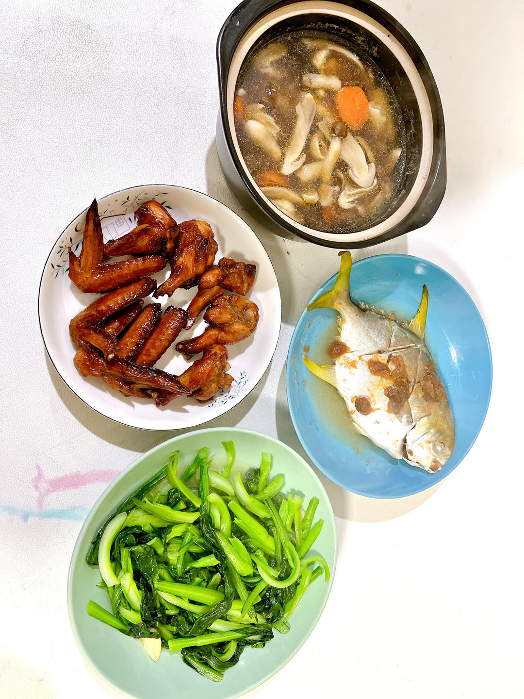 姬松茸鸡汤+蜜汁鸡翅+酸梅蒸金鲳+炒菜心
