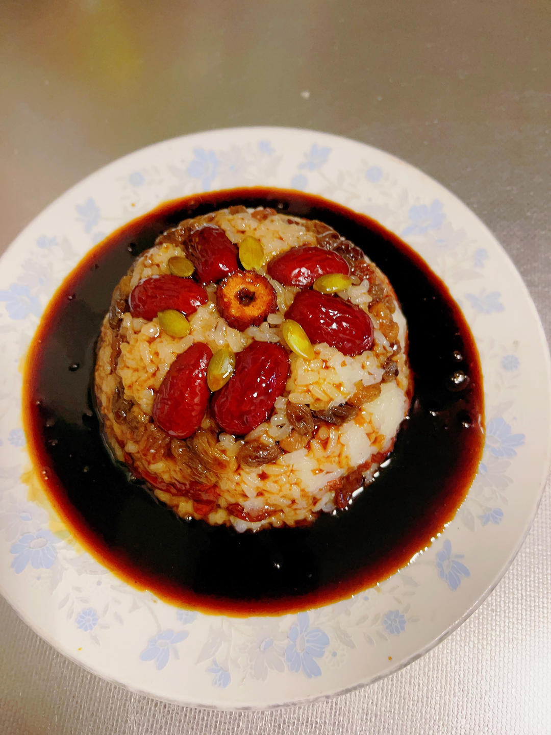 淋的红糖汁有些多了,好甜的八宝饭!