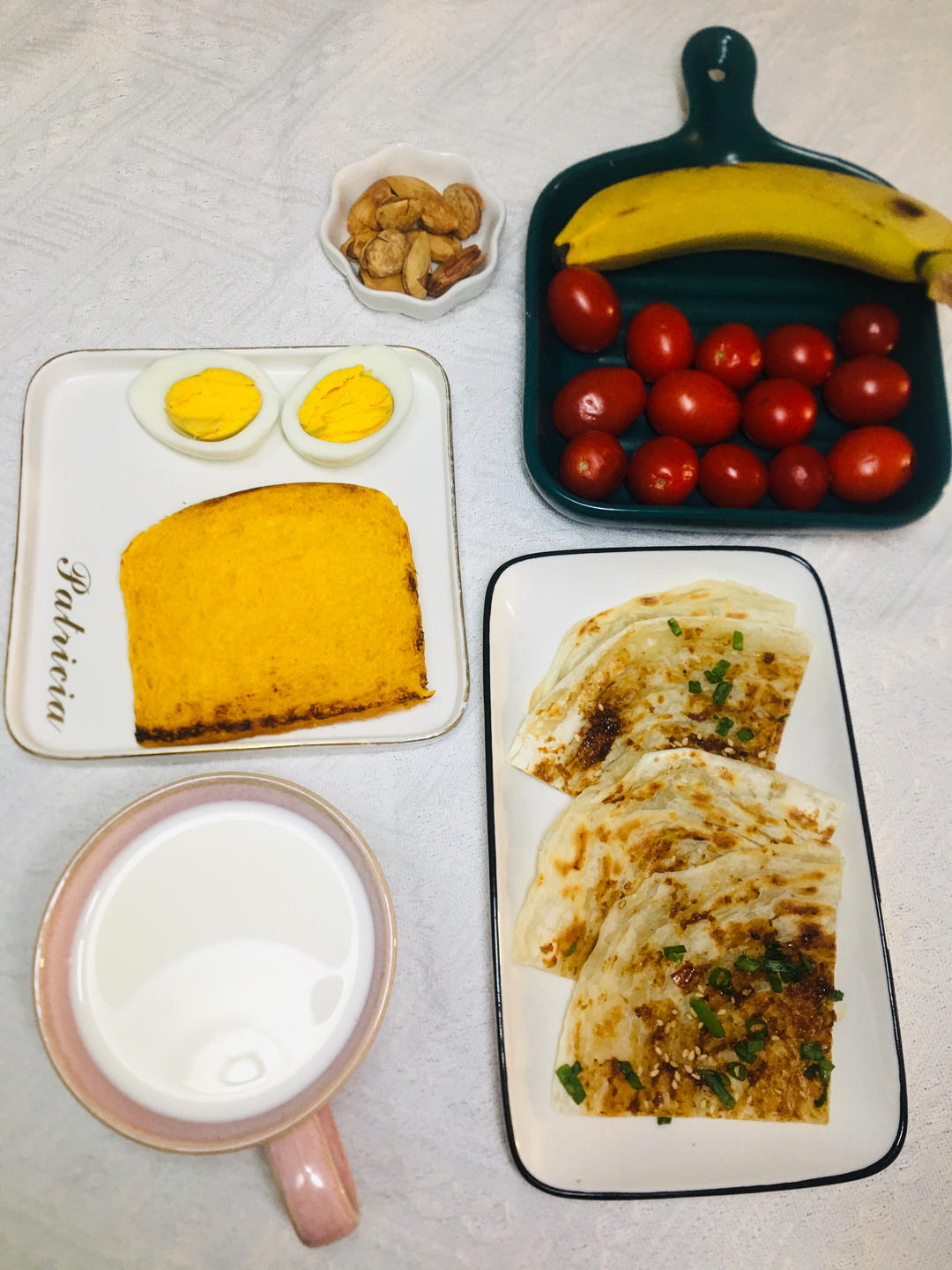 能量满满的早餐:南瓜吐司、酱香饼、牛奶、水煮蛋、水果