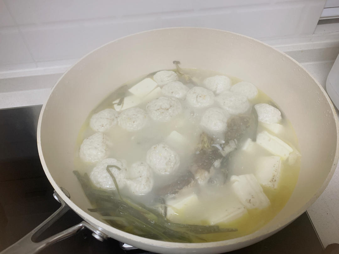 昂刺鱼先用开水烫了一下,去了粘液,然后再煎煮,加了豆腐和鱼丸,鲜!