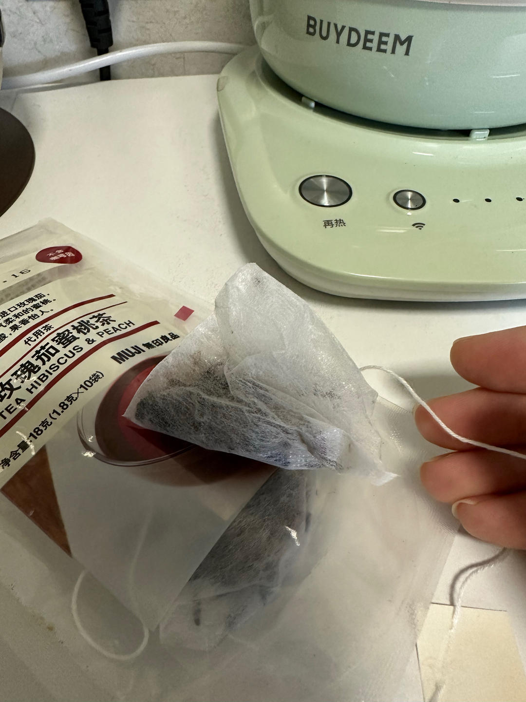 用北鼎养生壶煮一包无印良品的茶包,玫瑰茄蜜桃茶。这款茶没有咖啡因,酸酸的,颜色也好看。