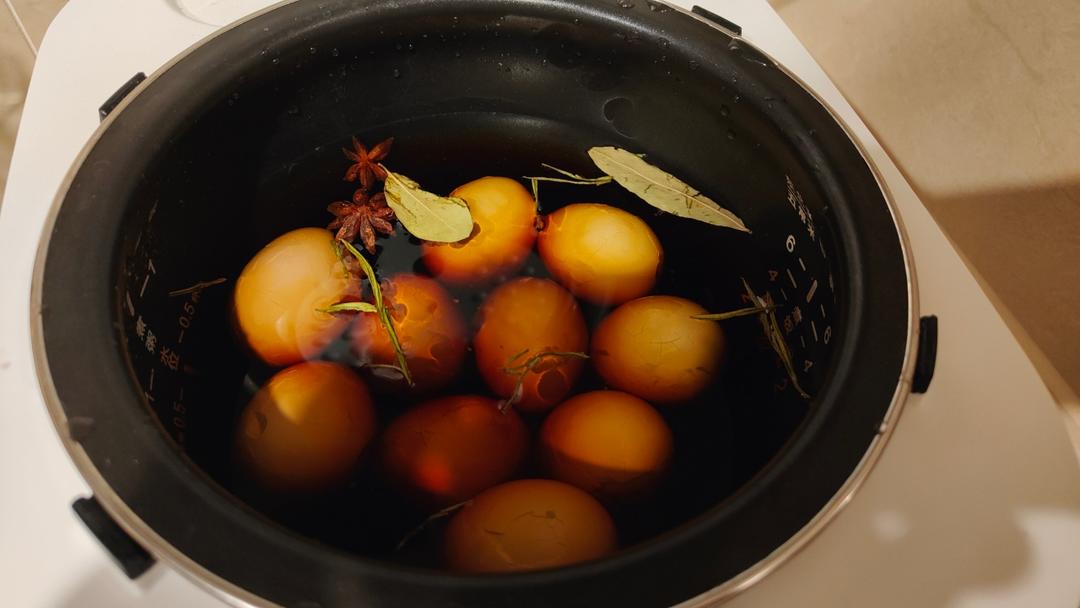 鸡蛋放入冷水锅(电饭煲)中,两两敲击出现漂亮的碎纹,在锅中放入调料(八角,香叶各2个,生抽,老抽适量,盐,糖各1小勺,茶叶少许),蒸煮模式1小时,保温半小时。取出即可食用,但是此时还不是味道最佳时刻。