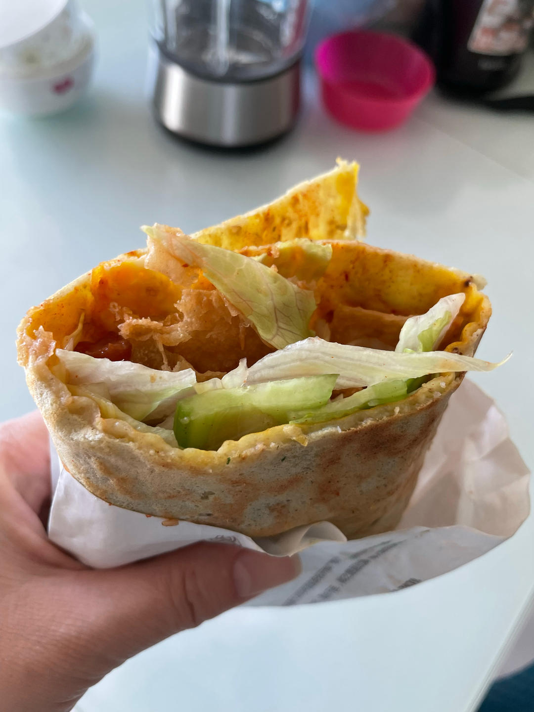 恋影双双 做过 煎饼果子山东煎饼全教程 (工具材料教程全套有小视频) 今天早上试了一下电饼档,也很好煎,并且摊的够大,我知道我第一次为什么推不开面团了,发酵时间不够,面没发起来,今天我先调好面糊,再去炸薄脆和准备其他的材料,今天把薄脆擀的更薄,炸出来更好吃#早餐•2023年1月7日# 2023-01-07
