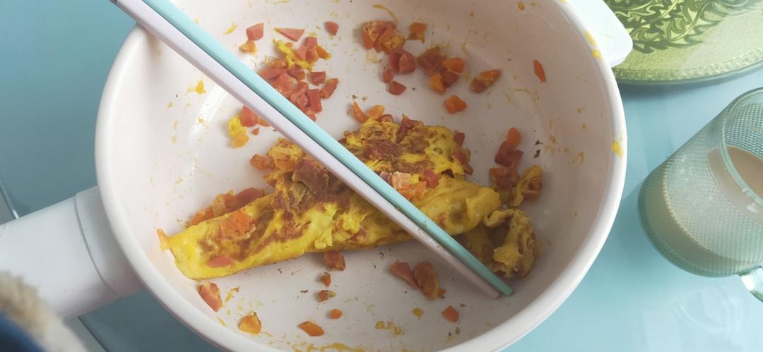 厨房小白,卷是一点都没卷上,原因应该是火腿丁和胡萝卜丁切大了,但好吃