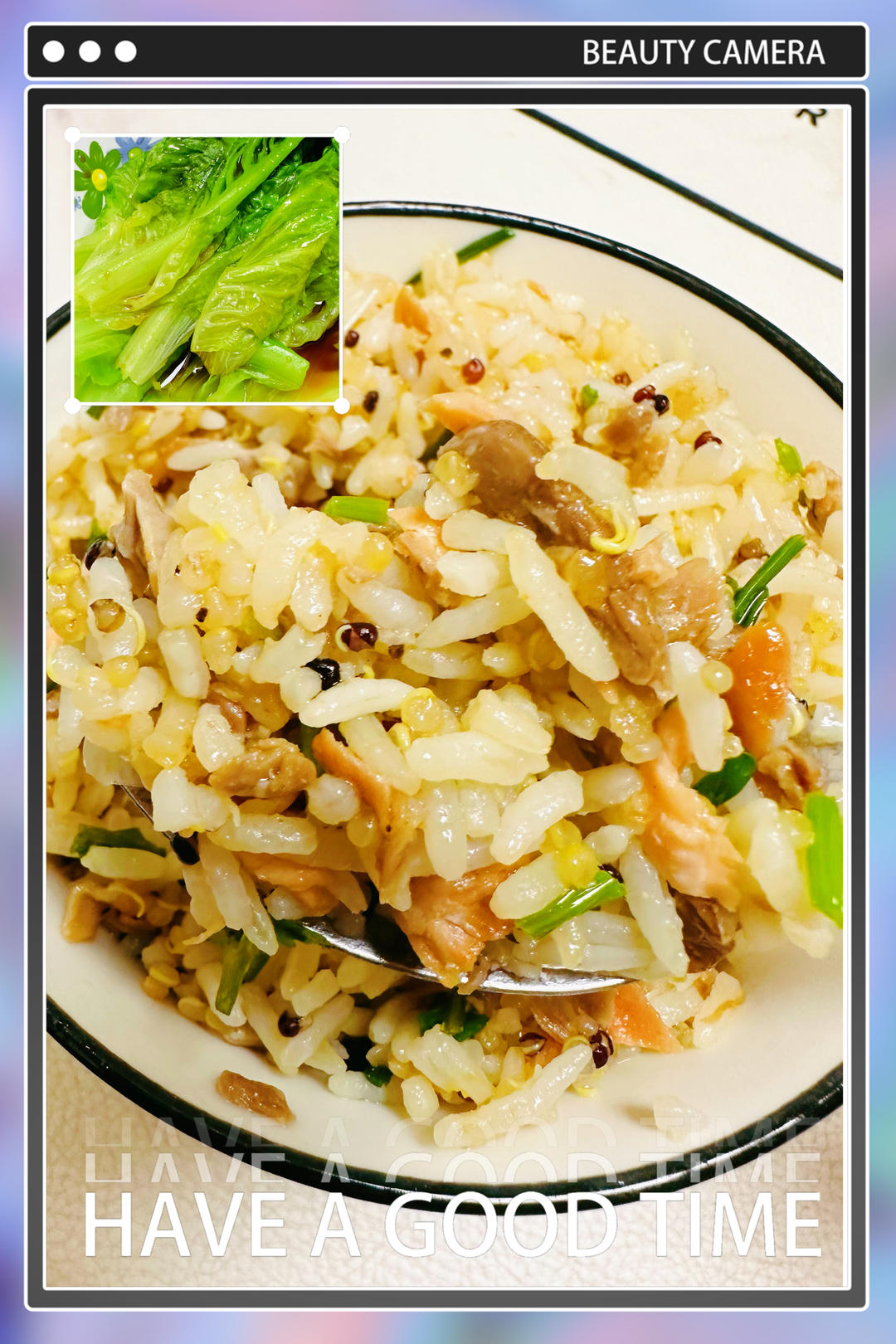 久违的三文鱼焗饭😋加了三色藜麦,更加营养,再配上一份白灼生菜,很是满足🤗