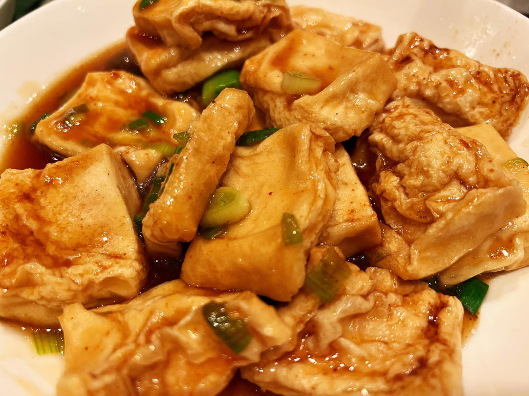 闹闹的厨房 做过 烤千叶豆腐 千叶豆腐切小块,表面刷油后,放入空炸锅400华氏度(200摄氏度)烤十五分钟,中间拿出来翻面刷油再放回去继续烤,炒锅内加入一勺耗油,适量味极鲜,一小碗水,葱末,加入淀粉水勾芡后放入烤好的豆腐,撒上烧烤粉拌匀即可 2023-01-10
