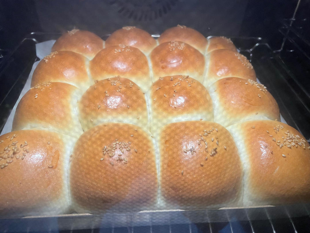 两个450g吐司面团,汤种,后盐后油,分60g一个,包25g紫米馅,包圆,28寸烤盘16个正好,38度30分钟发2倍大,刷牛奶洒芝麻,175度烤17分钟,皮略硬,下次少2分钟,之前圆面包和吐司一起发酵1小时以上,都发过了,烤后都是大洞,也不软,二发30分钟足够了,组织很柔软,紫米馅米水比1比2,洗净后浸泡过夜,按红豆馅的方法高压锅操作,趁热拌入糖和少量黄油即可
