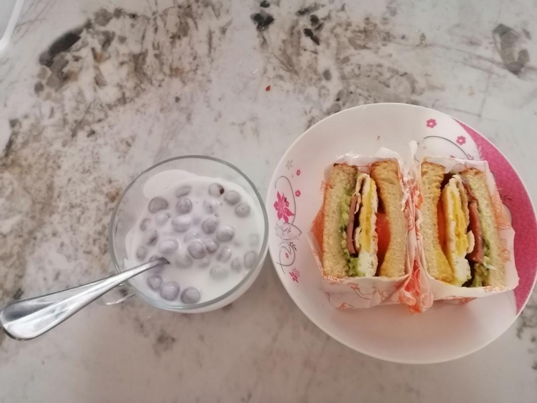 酸奶,自已做的面包,牛油果三明治