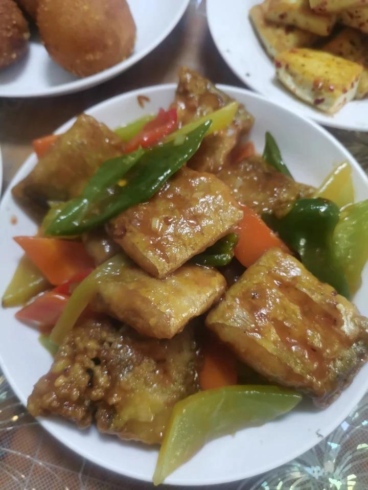 炭哥妈咪 做过 糖醋带鱼 #糖醋带鱼# 用料:带鱼550克,洗净切块,加生姜丝,盐3克,白胡椒2克,料酒10克,腌制30分钟以上。拍干地瓜粉,油6成热下锅,炸定型捞出,油7成热复炸45秒,捞出备用。配菜焯水两分钟备用: 红萝卜切片,青红椒切片糖醋汁:糖30克,香醋35克,生抽10克,番茄沙司50克,地瓜粉8克,清水100克适量,白胡椒粉1克, 油下锅烧热下蒜末,葱白末炒香,下调好的糖醋汁,烧开搅匀。加入炸好带鱼,配菜搅匀, 2023-02-05