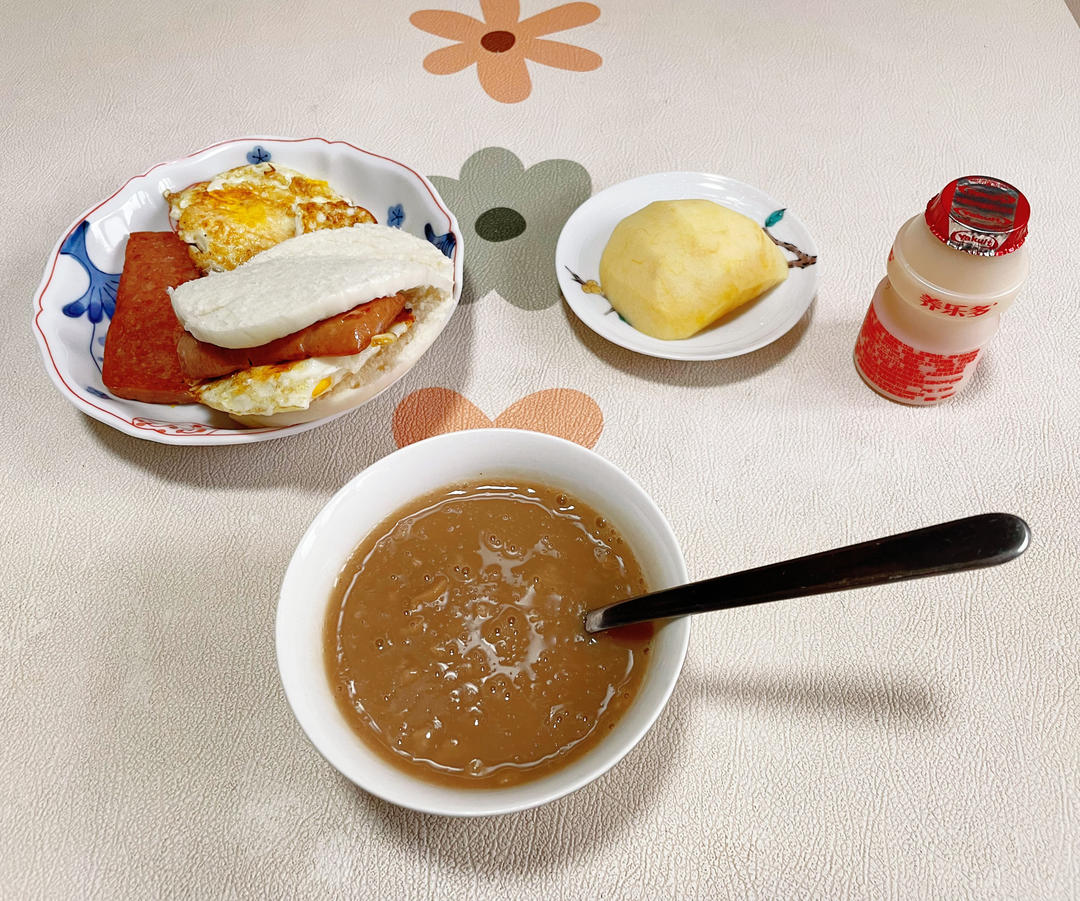 银耳葡萄干鹰嘴豆糊糊;煎午餐肉、鸡蛋;苹果养乐多。一下开学了!