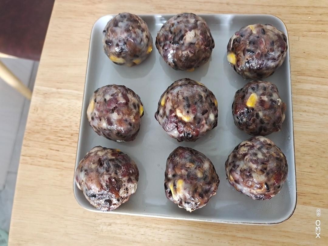 第一次做,杂粮泡了一夜,用蒸箱蒸了一个小时,团的时候太干了,但蒸出来不塌