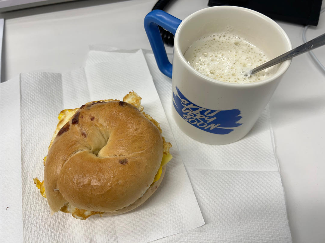 黑啤芝士贝果夹煎蛋、手冲豆浆