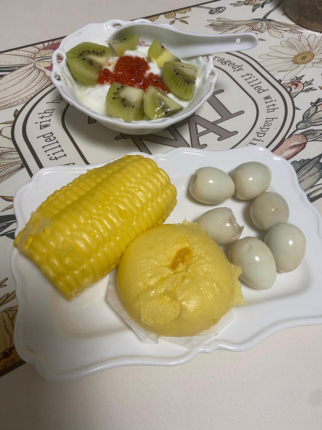 今日早餐,奶黄包,玉米香肠包,卤鹌鹑蛋,酸奶水果碗