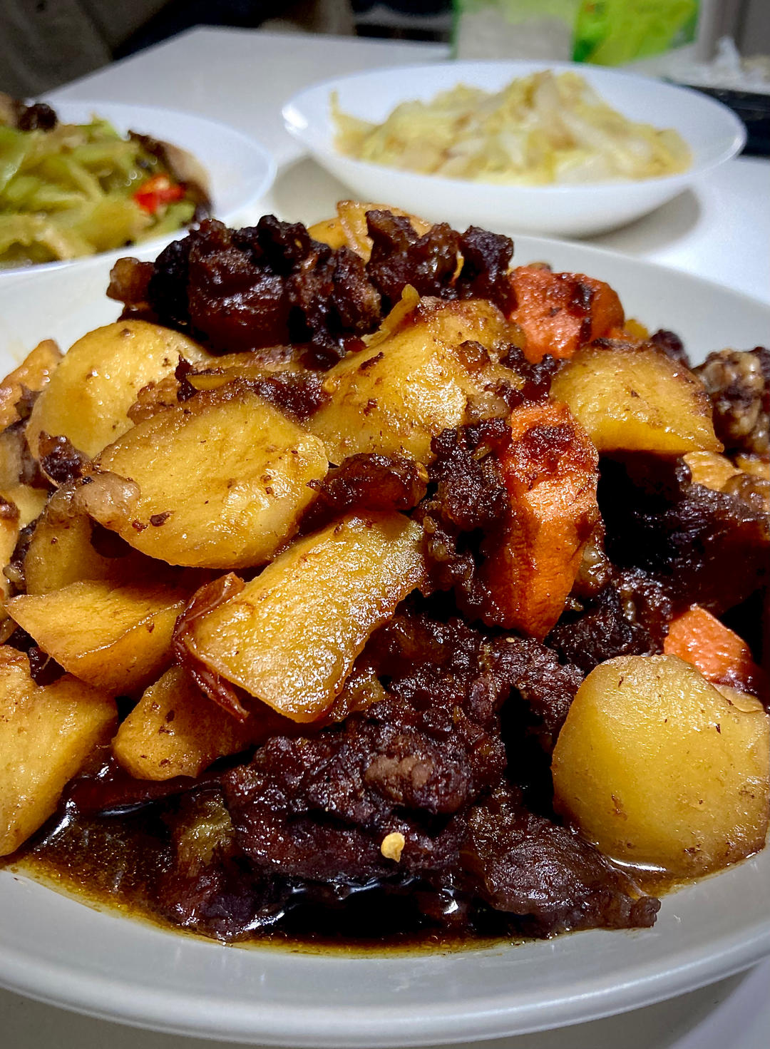 jane张景淳 做过 2023年03月03日 家常菜:牛骨肉炖土豆胡萝卜,西芹腊肉,清炒大白菜,私房糖三角。 人生,哪能事事如意;生活,哪能样样顺心。我们都坚强而努力的活着,但总会因为某种理由,最终选择向世界妥协。 2023-03-03