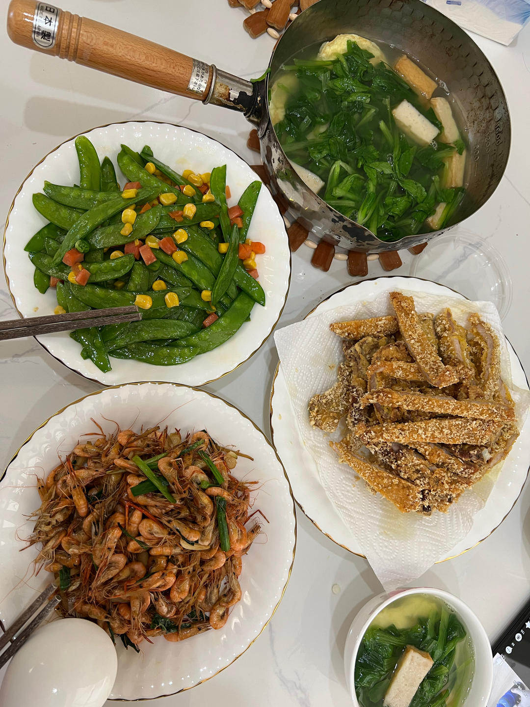 香炸猪排,油爆河虾,什锦荷兰豆,蛋饺鸡毛菜汤,周末在家好好吃饭。