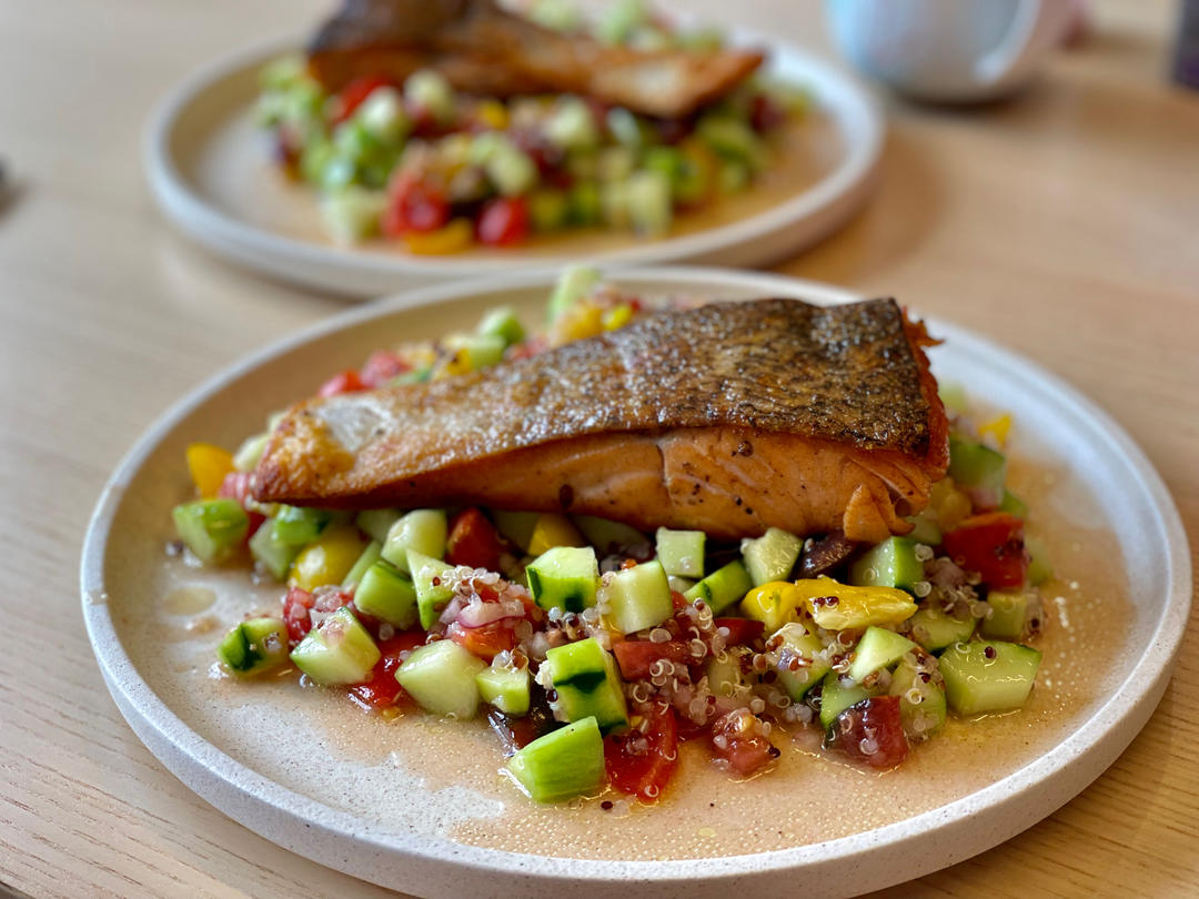 煎三文鱼配超级清新的藜麦番茄黄瓜沙拉,用的是自己家种的番茄和黄瓜。