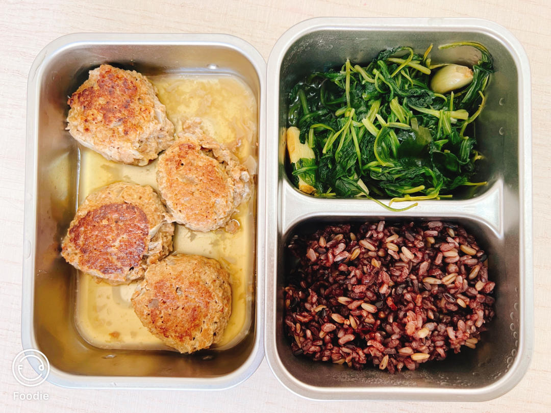 自制牛肉饼、清炒马兰头、杂粮米饭