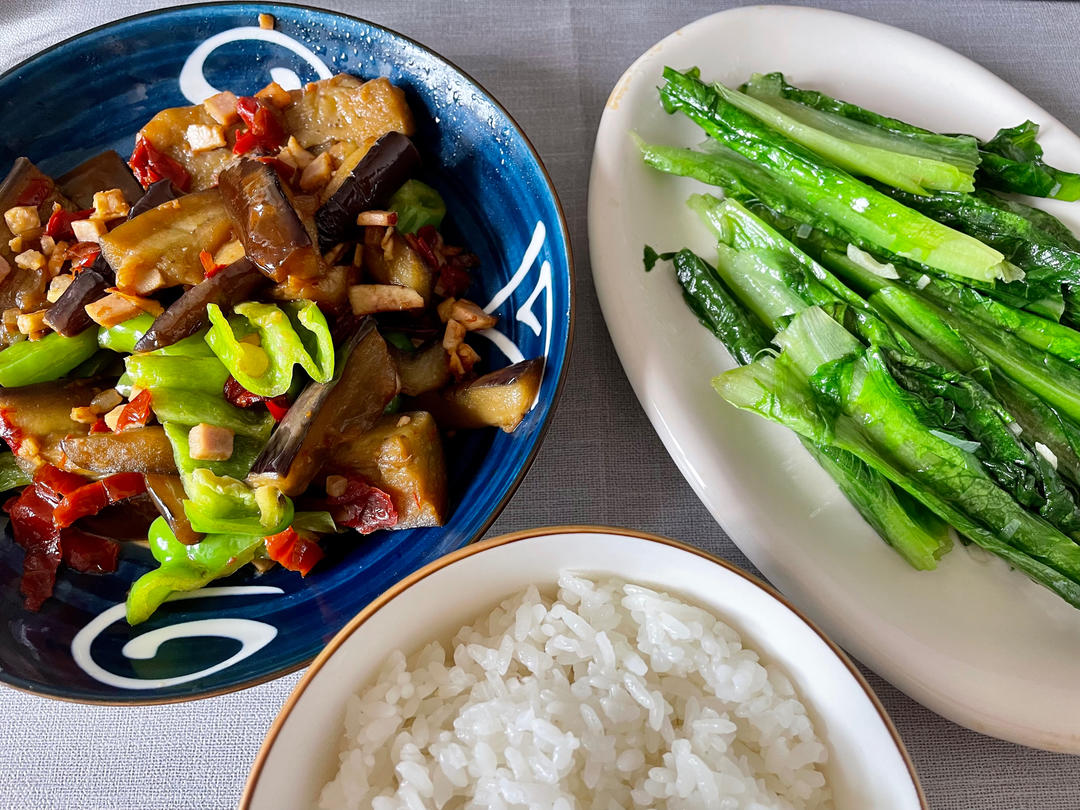 腊肉末烧茄子+炒油麦菜+米饭