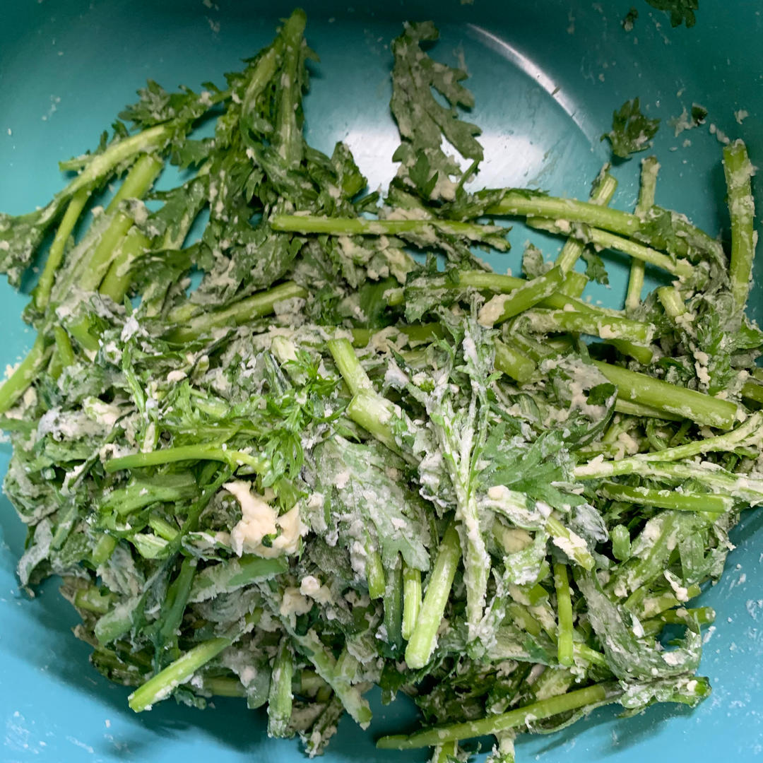 面粉好像加少了,加盐搅拌均匀,蒸好后料汁加入醋、油泼辣、蒜泥、香油,还不错。