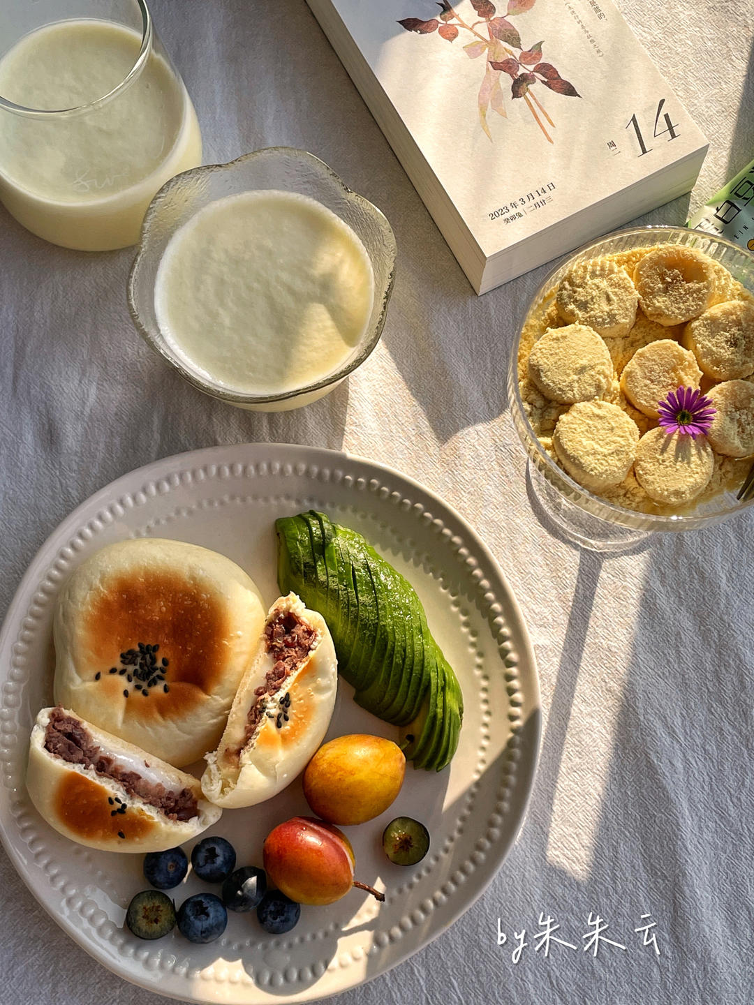 #早餐•2023年3月14日# 20230314玉米牛奶+麻薯红豆包+牛油果+西梅蓝莓+香蕉豆乳盒子。