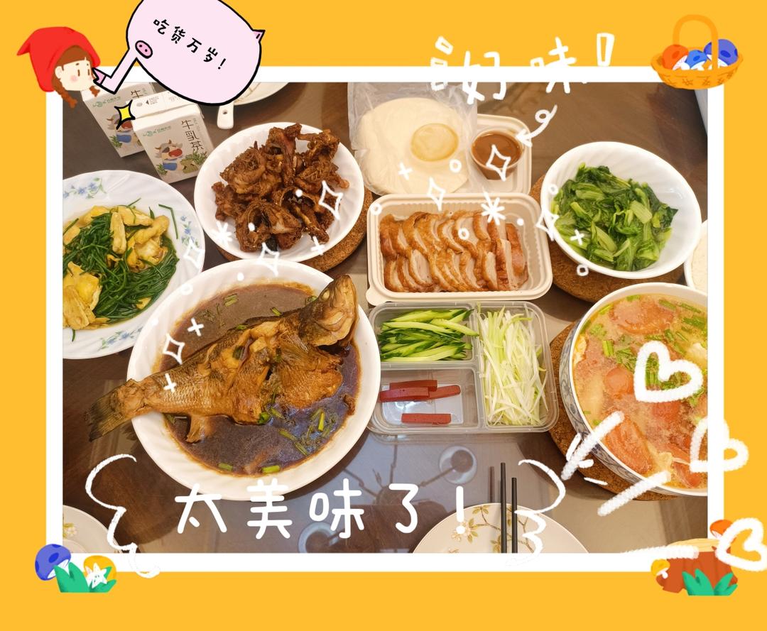 烤鸭2吃,沙葱炒蛋脆脆的好吃,红烧鲈鱼Yummy。