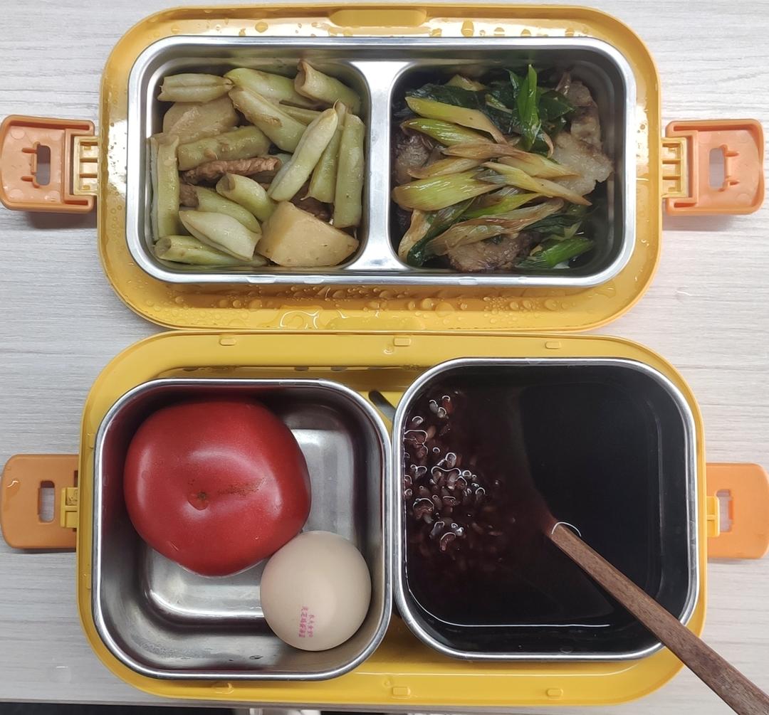 芸豆土豆炖肉,蒜苗炒腊肉,粥,西红柿和鸡蛋