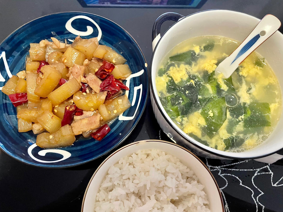 腊肉烧旱黄瓜+裙带菜蛋花汤+米饭