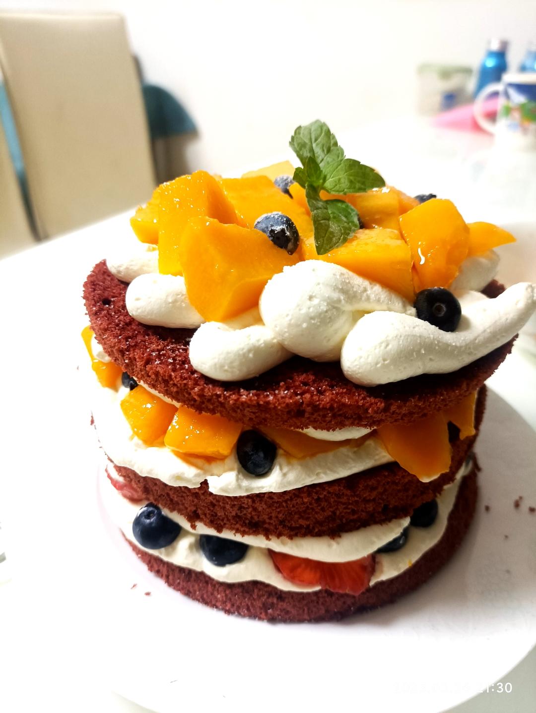 红丝绒蛋糕,蓝莓很甜,为蛋糕增色不少
