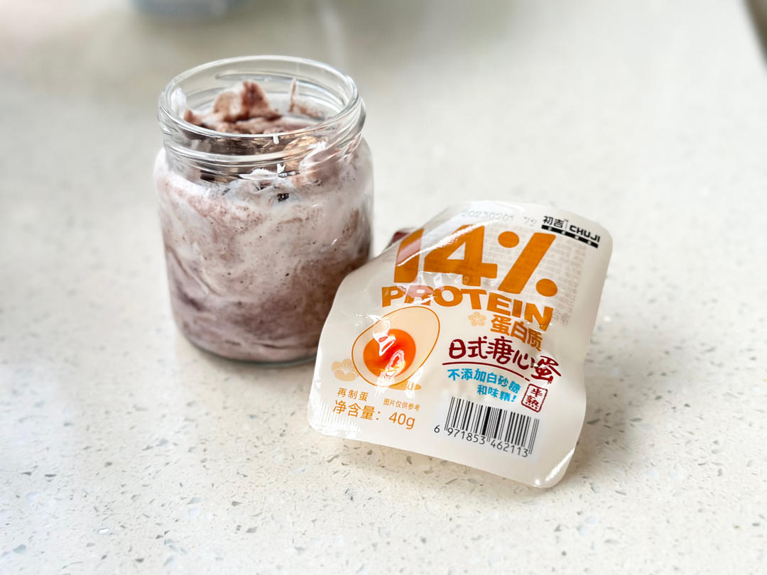 100g无糖酸奶,10g黑麦片,可可粉,两小片无花果干、几片椰子片、5g黑巧麦片、蓝莓,一个初吉的溏心蛋;