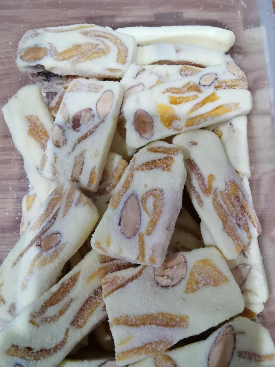 淘淘妈咪5 做过 超火爆的芒果奶糕——配方制作分享 落基山迷你棉花糖,安佳黄油,安佳奶粉,盒马芒果干,展艺水怡,加了一些巴旦木,做了半份,加水怡的目的是为了加进去更多的奶粉?冷藏半小时后用快刀切片。 2023-04-13
