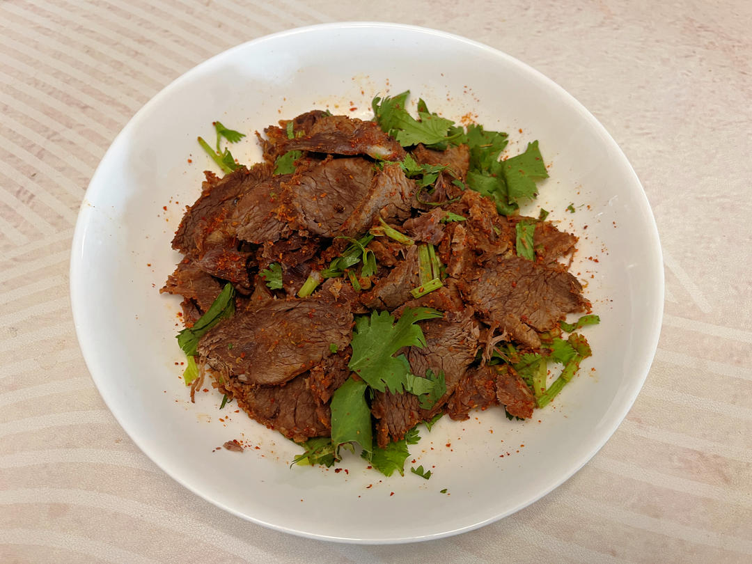 高压锅排气后13分半,1kg的牛腱子整块压,软硬刚合适。汤+4勺盐基本还是没味道,这样凉拌加味合适