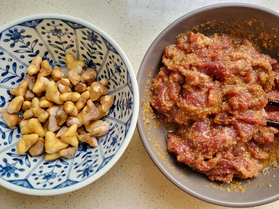 石头记_美食 做过 晚餐•2023年4月14日 粉蒸牛肉牛腱子肉切薄片撒上盐分次加水搅拌上劲后拌上提前浸泡好的米粉。米粉没有添加任何调料,连盐都没有。一边拌一边加盐、蚝油、胡椒和味精。拌匀后淋上植物油,腌制半小时。碗底铺上稀罕物-菱角,电压力锅30分钟。吃时可撒点香菜和糊辣椒末,好吃极了。#晚餐•2023年4月14日# 2023-04-14