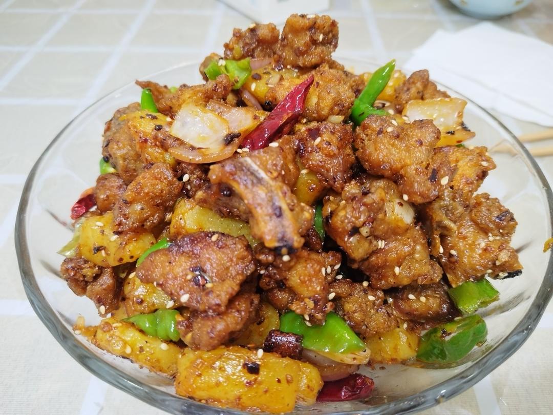 用排骨和掌中宝炒的,土豆稍微少了点,主打吃肉