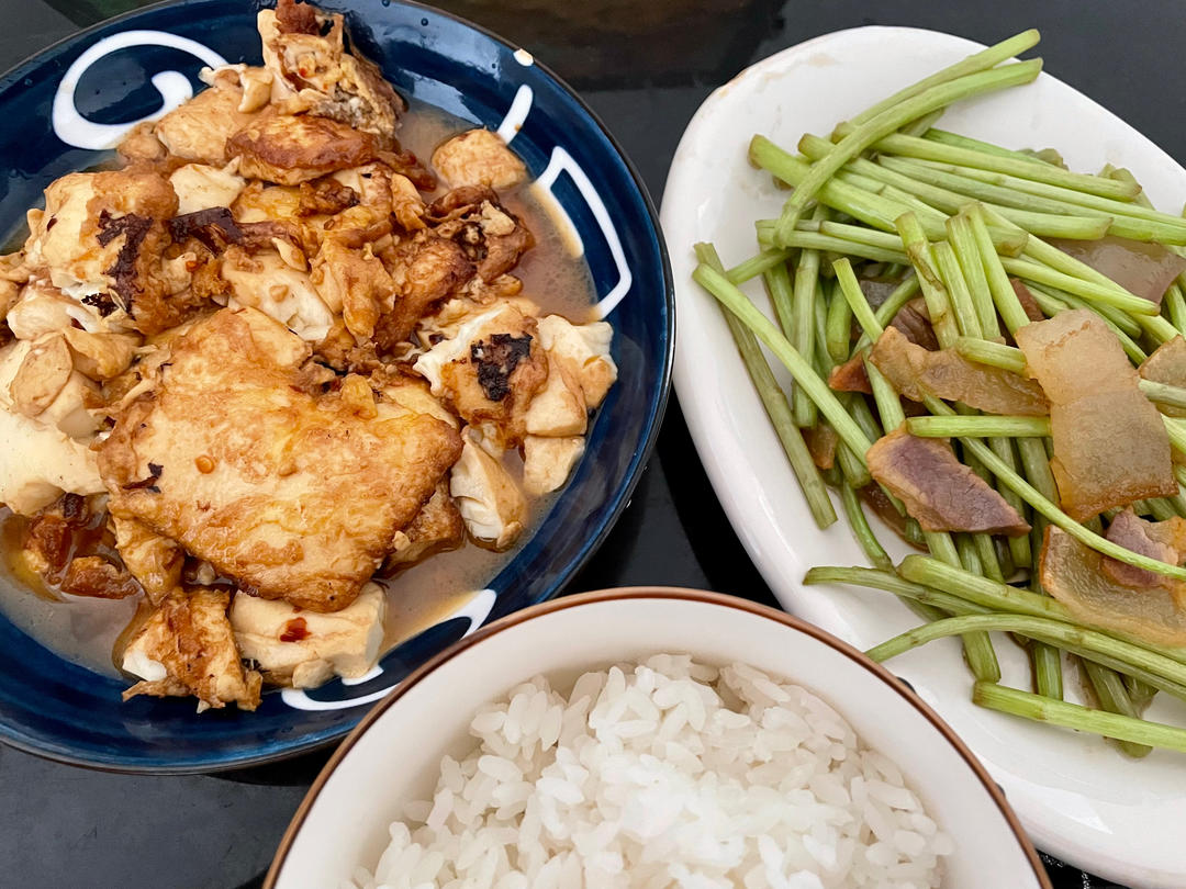 煎豆腐+泥蒿炒腊肉+米饭