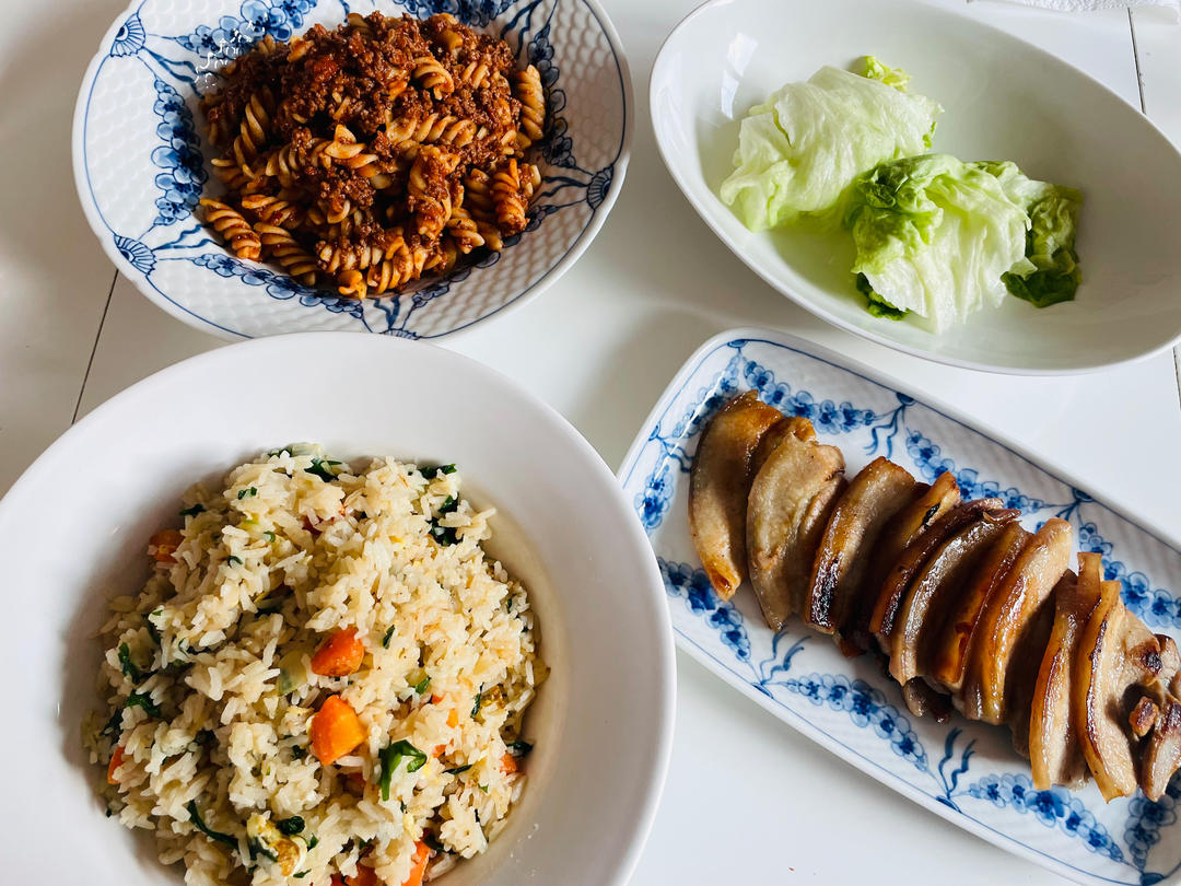 工作日晚餐,中西合璧的“自助餐”,说白了就是清空冰箱吃剩饭。😂