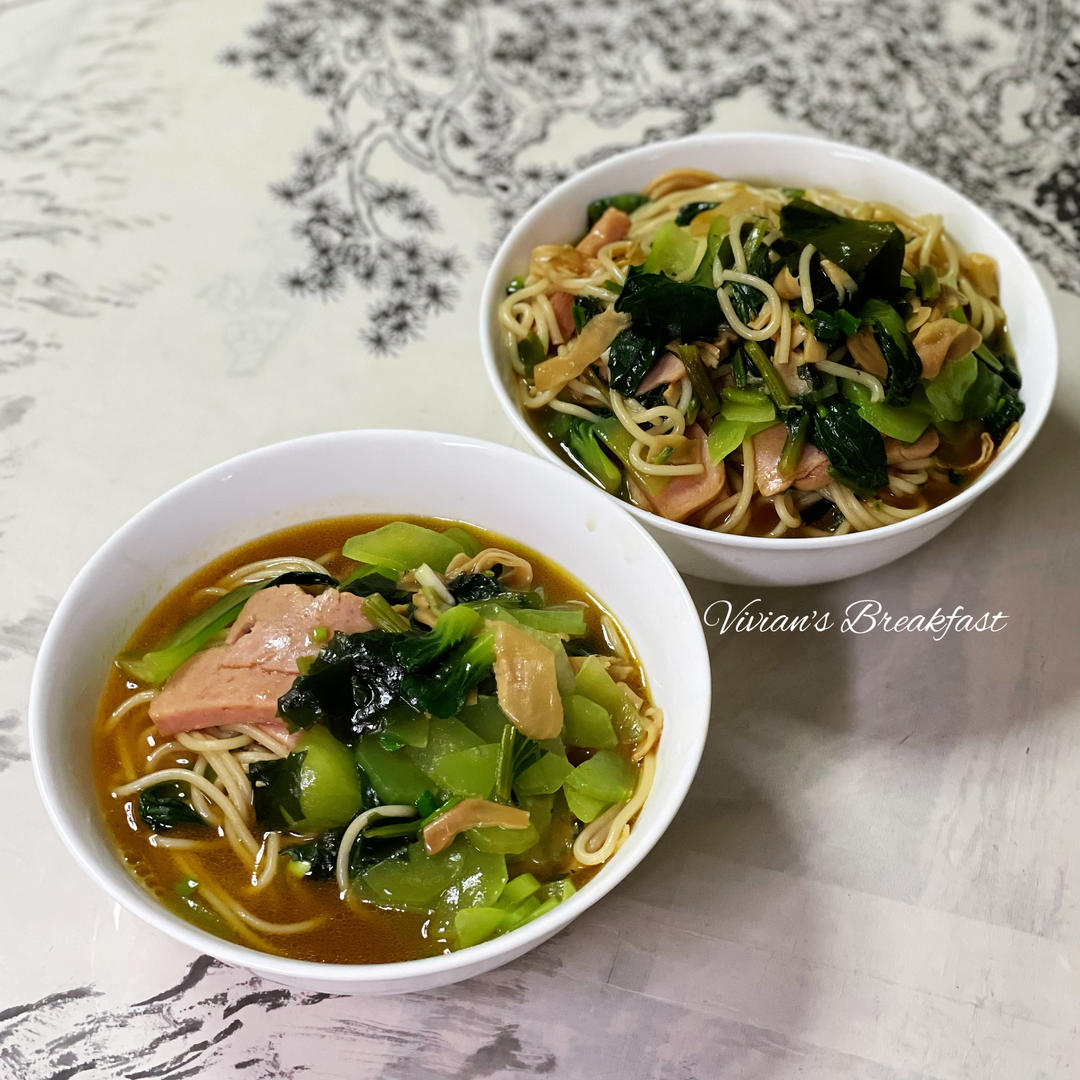 快手午晚餐|妈妈的最爱 - 低温午餐肉笋衣清油面~🌷